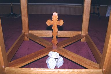 This photo shows the table without the top installed. The top would be installed during the consecration with pegs hammered into the legs with four river stones. |