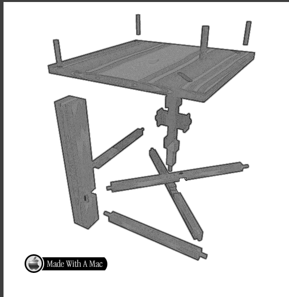 This is a line rendering of a 3d model that I made in Infini-d 3.0. It was meant to show all the major parts and how they fit together. Note the pegs for the table top. |