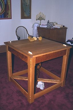 Andrew Fetchina designed the "bread board" construction of the table top. No nails were used anywhere in the construction.Note the small wood pegs for the edge. Natural glue was used where absolutely necessary. An icon of each of the four evangelists mark each corner. |